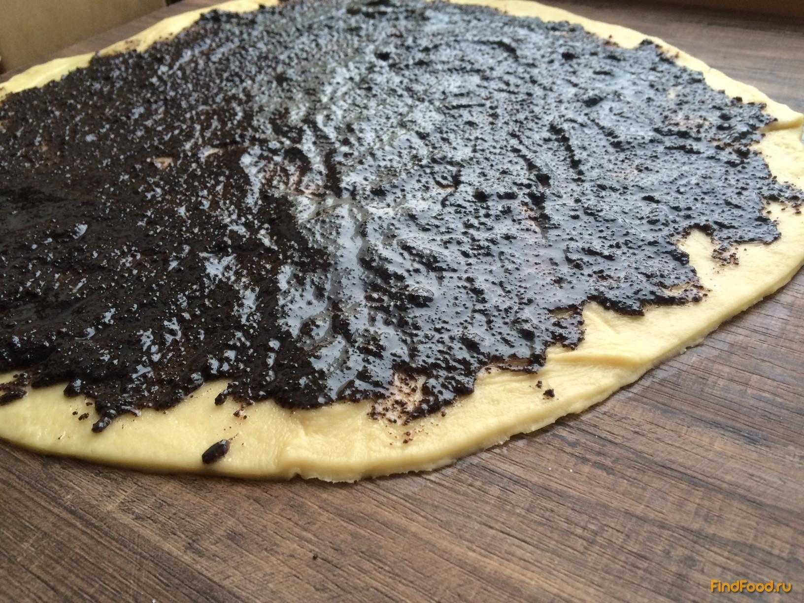 Я люблю рулеты большие, поэтому тесто не разделяю. Вы же можете испечь не один рулет, а например несколько маленьких. Решать вам. Тесто раскатать в пласт толщиной примерно 3-4 мм. На всю поверхность выложить маковую начинку и аккуратно ее разровнять.